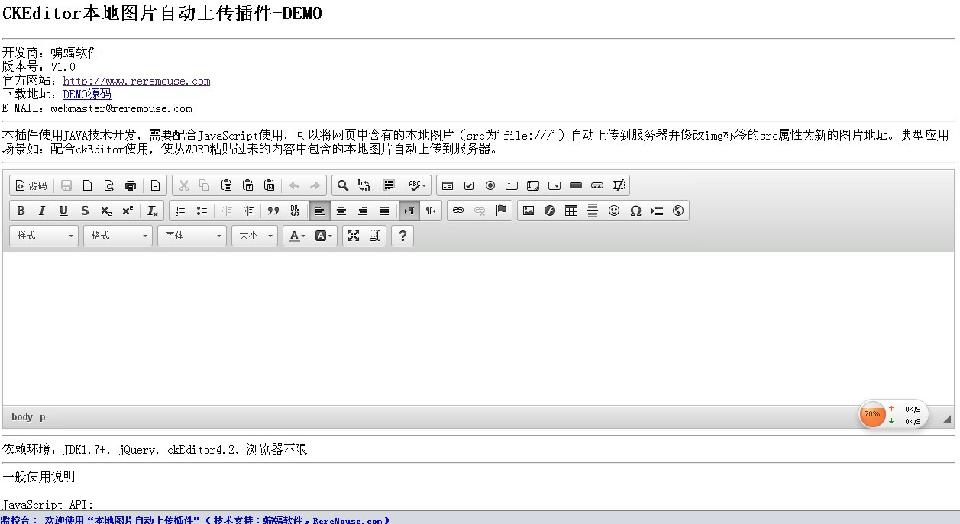 本站自主开发的“CKEditor本地图片自动上传”插件已经开发完成并发布,该插件使用完全免费。演示界面及URL如下: